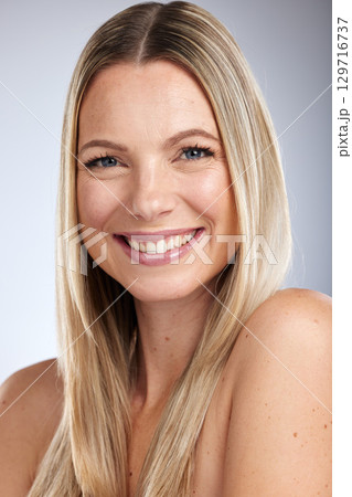 Portrait, beauty and skincare with a model woman in studio on a gray background for natural treatment. Face, happy and smile with an attractive young female posing to promote a cosmetic product