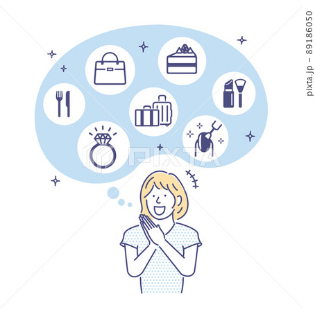手を合わせて笑顔の若い女性・主婦 ベクターイラスト ( 将来設計・お金持ち・買いたいもの )
