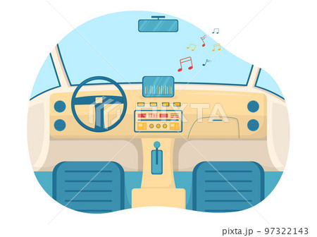 Driving a Car Listening to Music with Loud Speakers or Sound System in Flat Cartoon Poster Hand Drawn Templates Illustration