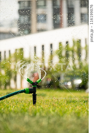 Green lawn automatic irrigation system in city park. Watering lawn at heat summer. Close up. Outdoors.