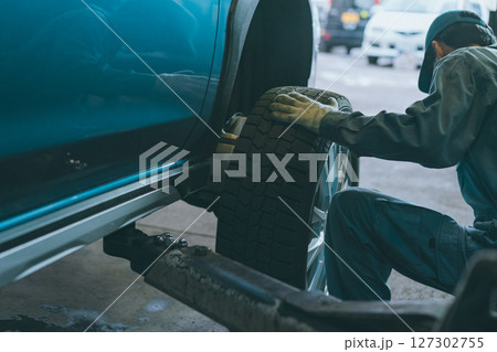 タイヤ交換をする自動車整備士