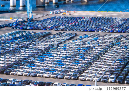 日本の横浜都市景観 日本経済の呪縛…大黒ふ頭に並ぶ自動車…奥は自動車運搬船「ELEGANT ACE」