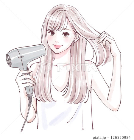 髪を乾かす女性のイラスト|美容・ヘアケア・日常シーン素材