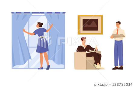 A Domestic Scene Featuring a Housekeeper and a Relaxed Homeowner in a Cozy Environment