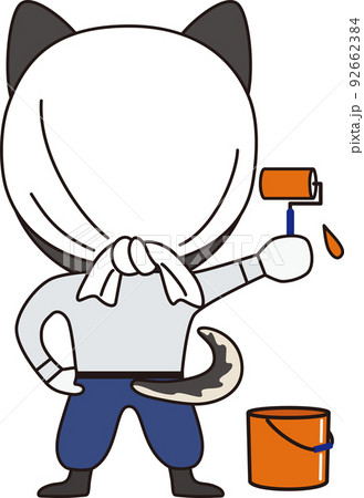 頭にタオルを巻き、塗装用ローラーを持った黒柴犬のイラスト