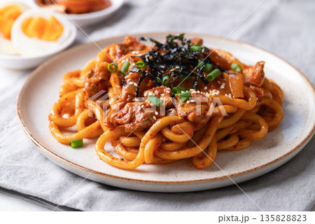 Stir fried Udon noodle with kimchi cabbage, pork, spring onion, sesame seed and seaweed on top