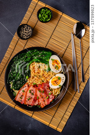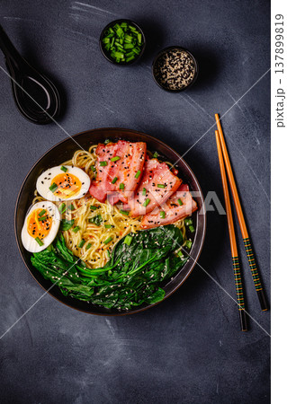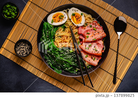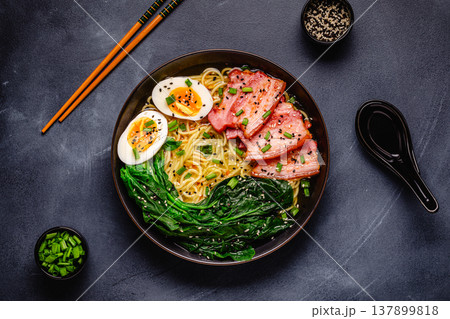 Traditional ramen noodle soup with brisket, spinach and egg.