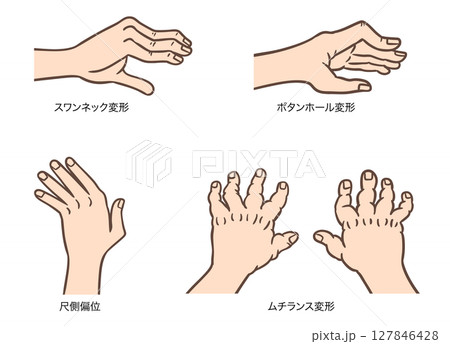 関節リウマチによる手指変形:スワンネック、ボタンホール、尺側偏位、ムチランス変形