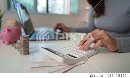 Budgeting. Woman calculating expenses with calculator and laptop.
