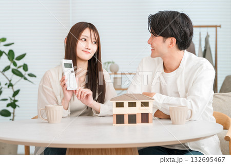 住宅模型を見ながらマイホームの予算を話し合う若いアジア人夫婦