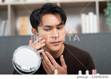 Closeup hands young woman applying cream or lotion while looking mirror in living room at home.