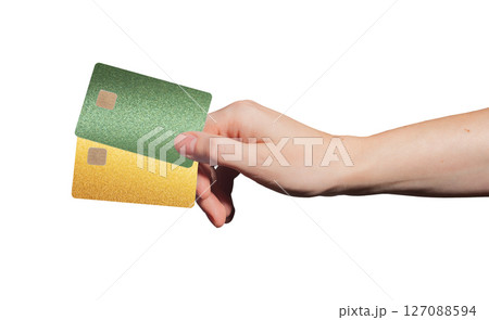 Commercial payment concept. Hand holding two plastic bankcards with chip for credit, debit, loan,