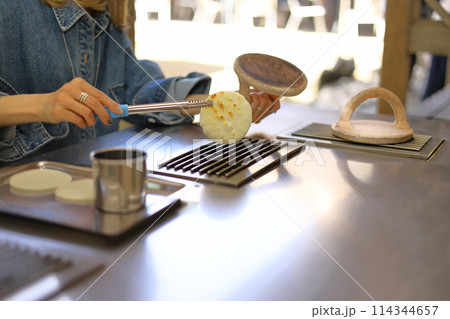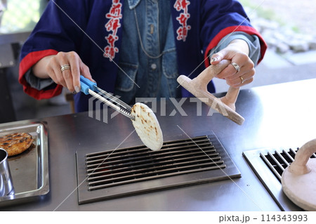 草加せんべい手焼き体験をする女性