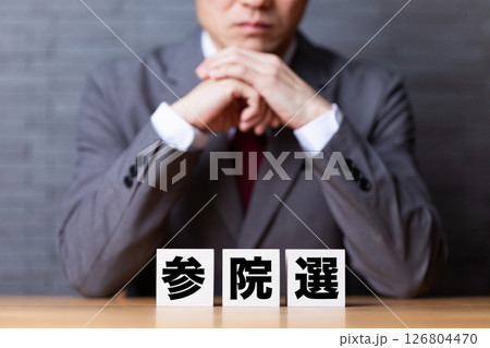 参院選のブロックとスーツを着て悩むミドル男性ビジネスマン