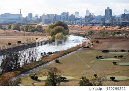 河川敷と都市の風景 グラウンドゴルフ場と川の流れ
