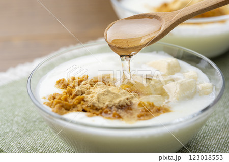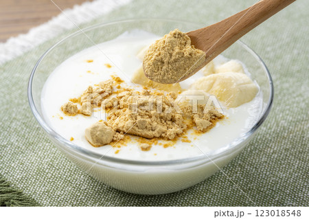ヘルシーな朝食バナナヨーグルトに香ばしいきな粉トッピングとコピースペース