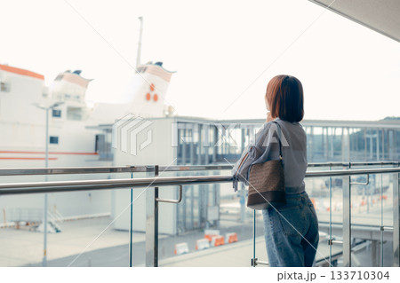 船着き場を眺める女性の横顔シーン