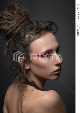 Studio portrait of beautiful woman with red eye shadows and dreadlocks
