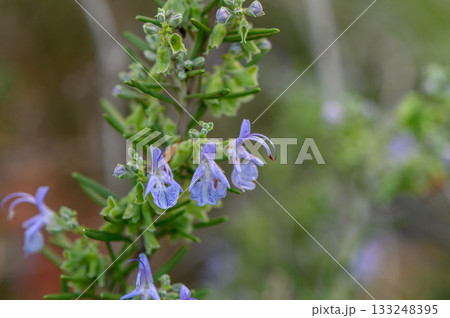 Lush rosemary plant showcases delicate blue flowers in a serene natural setting during the golden hour
