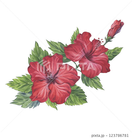 Watercolor composition of hibiscus branch with red flowers and green leaves
