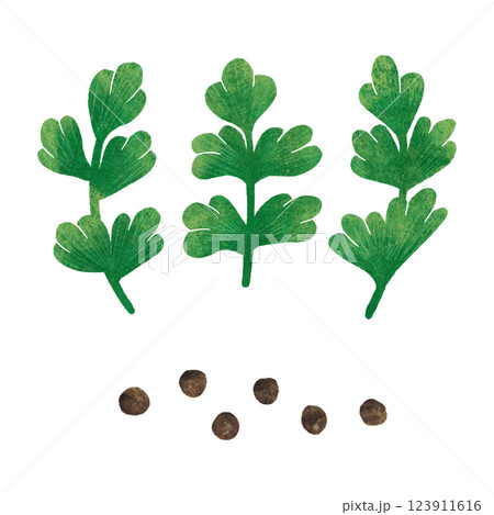 A set of sprigs of parsley and black pepper with peas, digital illustration on a white background