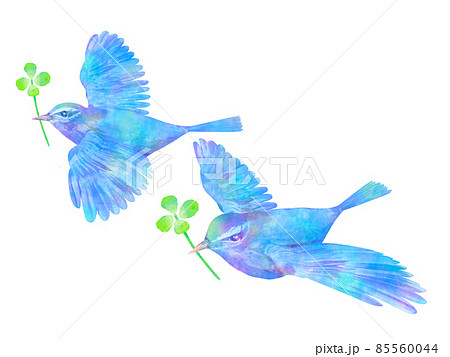 青い鳥と四つ葉のクローバー 水彩画風 手書き風