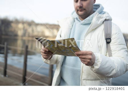 Male hiker reading map hiking trip looking to find place to go. Search, map and man lost in forest with guide to camp in woods or thinking of navigation or direction.