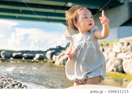 河川敷で川遊びする赤ちゃん 好奇心 指をさす 見上げる