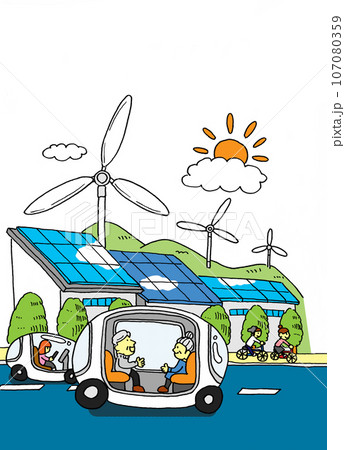 自動運転車や自然エネルギーの活用による脱炭素社会の実現のイメージイラスト(背景透過)