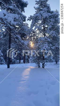 Snowy pine forest with winter footpath and sunlight at blue hour in Finland