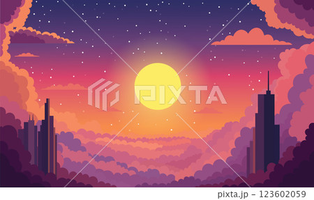 Beautiful Majestic Sky Panoramic with Skyscrapers Building and Sun Light at Sunset Sunrise