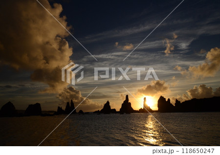 橋杭岩の夜明けと雲の切れ間の美しい海岸