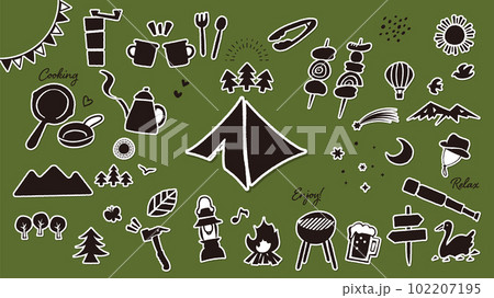 キャンプグッズ、アウトドア用品とレジャーのベクターアイコンイラスト素材セット。シンプルモノクロステッ