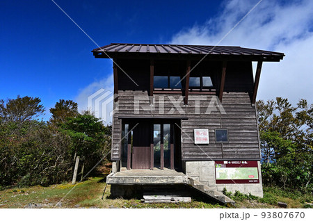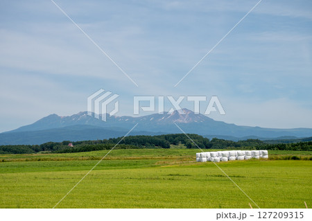 初夏の青空と残雪の火山の山頂 十勝岳