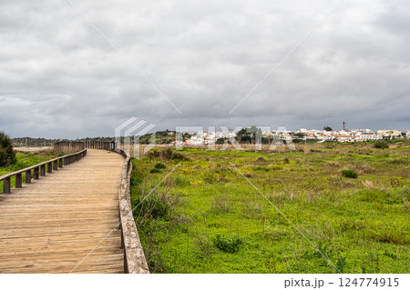 Wooden walkways lead to water in famous beach of Tres Irmaos in Alvor, Portimao, Algarve, Portugal, Europe