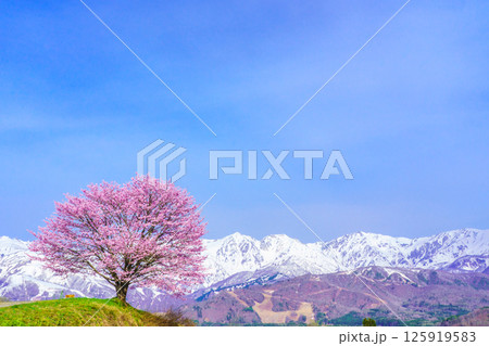 白馬村野平地区からの満開の一本桜と雪の白馬岳