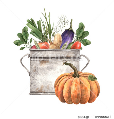 Watercolor composition with a rusty barrel and various vegetables: pumpkin, pepper, onion, tomato, radish, eggplant, potato. Elements are drawn by hand. It can be used in posters, cards, paper,