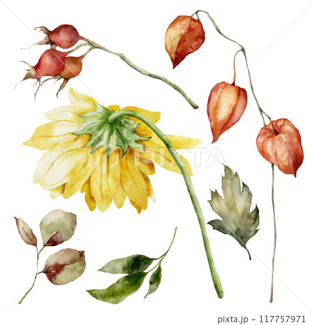 Watercolor meadow flowers set of aster, physalis and dog rose. Hand painted floral elements of wildflowers isolated on white background. Holiday Illustration for design, print, fabric, background.