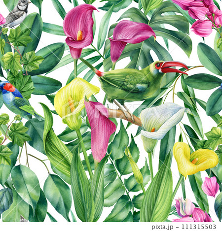 Tropical flower, Palm leaf watercolor botanical summer Seamless pattern. Watercolor tropical background hand drawn flora