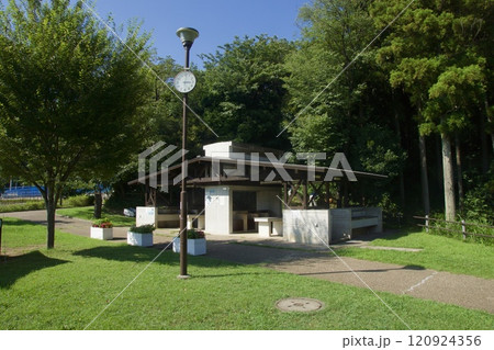 神奈川県相模原市 道保川公園水鳥の池と新緑と公園管理棟