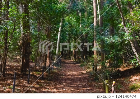 竹林の小径を歩く若い外国人旅行客のイメージ素材