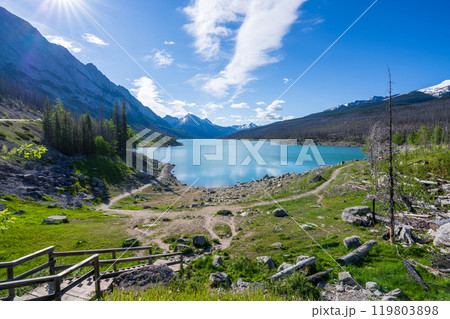 Beautiful natural scenery in Jasper National Park. Medicine Lake in June summer sunny day. Alberta, Canada. Medicine Lake Lookout wooden stairs.