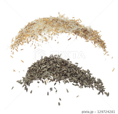Paddy Rice grain fly in mid air. Yellow Golden Paddy Rice falling scatter, explosion float in shape form line group. White background isolated freeze motion high speed shutter