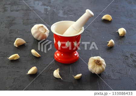 Onions and garlic over black background. Still-life of onions and falling garlic on black background