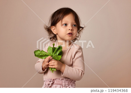 smiling child girl holding fresh green salad on beige background. healthy baby food.