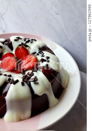 Rich and silky chocolate pudding topped with smooth vanilla sauce. A perfect harmony of deep cocoa flavor and creamy sweetness in every spoonful.