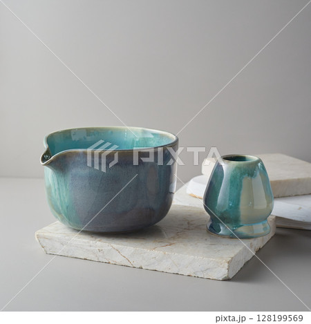 Matcha latte with ice. Green tea with milk in a glass on a light background with morning shadows.