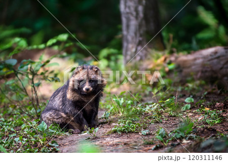 A solitary raccoon dog resting among lush greenery in a forest during daylight hours