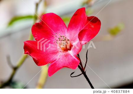調布市深大寺元町の植物園に咲く赤いバラ(原種交雑種センパフローレンス)の花
