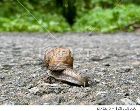 a beautiful snail with a shell crawls on asphalt in summer in a city park. High photo